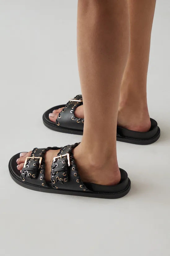 Faith: Giuliana Faux Leather Eyelet & Whipstitch Double Buckle Footbed Sliders